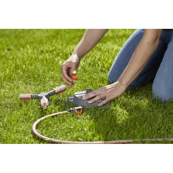 De sproeier heeft draaiende, zeer precieze spuitmonden voor gelijkmatige besproeiing zonder plassen. Het bereik van de sproeier kan afzonderlijk worden ingesteld door de watertoevoersnelheid aan te passen. De stevige basis garandeert een stabiele werking, maar kan ook mobiel worden gebruikt. Het fijnmazige, uitneembare vuilfilter maakt het reinigen heel eenvoudig.