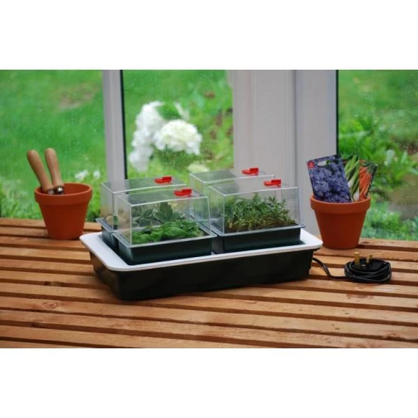 Elektrisch verwarmde zaaibak voorzien van een 8 watt verwarmde bodem waardoor de bodemtemperatuur ca. 8°C wordt opgewarmd, ideaal voor een snellere kieming en groei van zaaigoed of het bewortelen van stekken. Dit unieke model stelt u in staat meerdere soorten te kweken in 4 afzonderlijk geventileerde kweekkasjes.