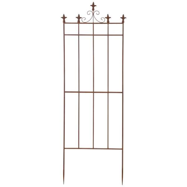 Statig hekwerk en plantensteun versierd met 5 Franse lelies. Het hekwerk heeft een roeste kleur en op die manier een prachtig rustieke uitstraling. Je kan het gebruiken als sierelement voor in de tuin als begeleiding voor klimplanten of als steun voor hoge vaste planten.