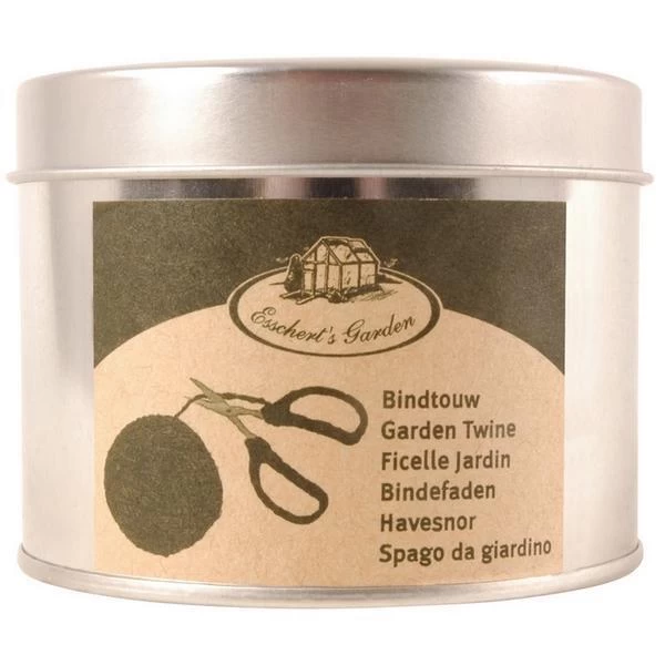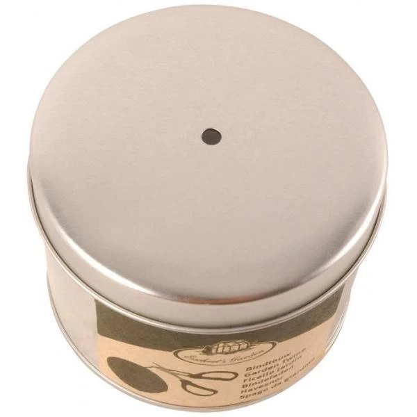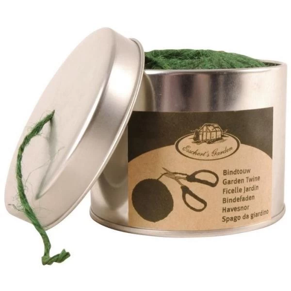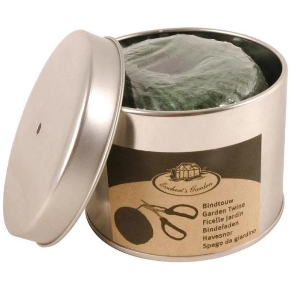 Bindtouw in blik. Je trekt eenvoudig het uiteinde van het jutetouw van binnenuit het hart van bolletje touw door het gaatje van de deksel van het blikje. Door dit handige en mooi ogende doosje raakt de touw niet meer in de war en valt het doosje beter op wanneer je het in de tuin gebruikt.