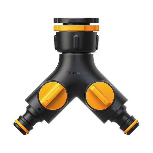 Sluit twee aparte tuinslangen aan op eenzelfde waterbron met de tweeweg kraankoppeling van Fiskars. De waterdruk van beide slangen is afzonderlijk regelbaar met de onafhankelijke aan/uit-regelkleppen.